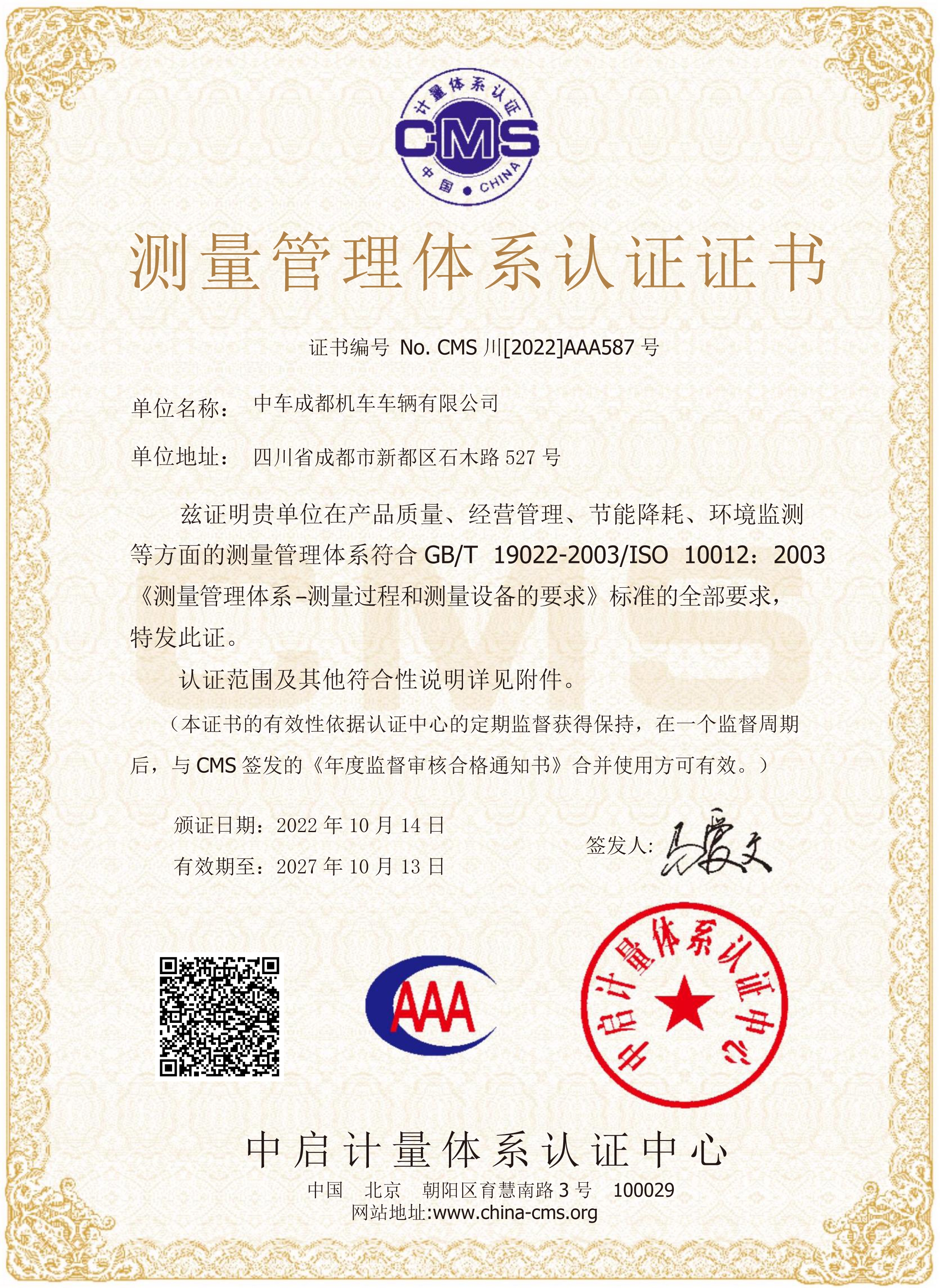 测量管理体系认证证书