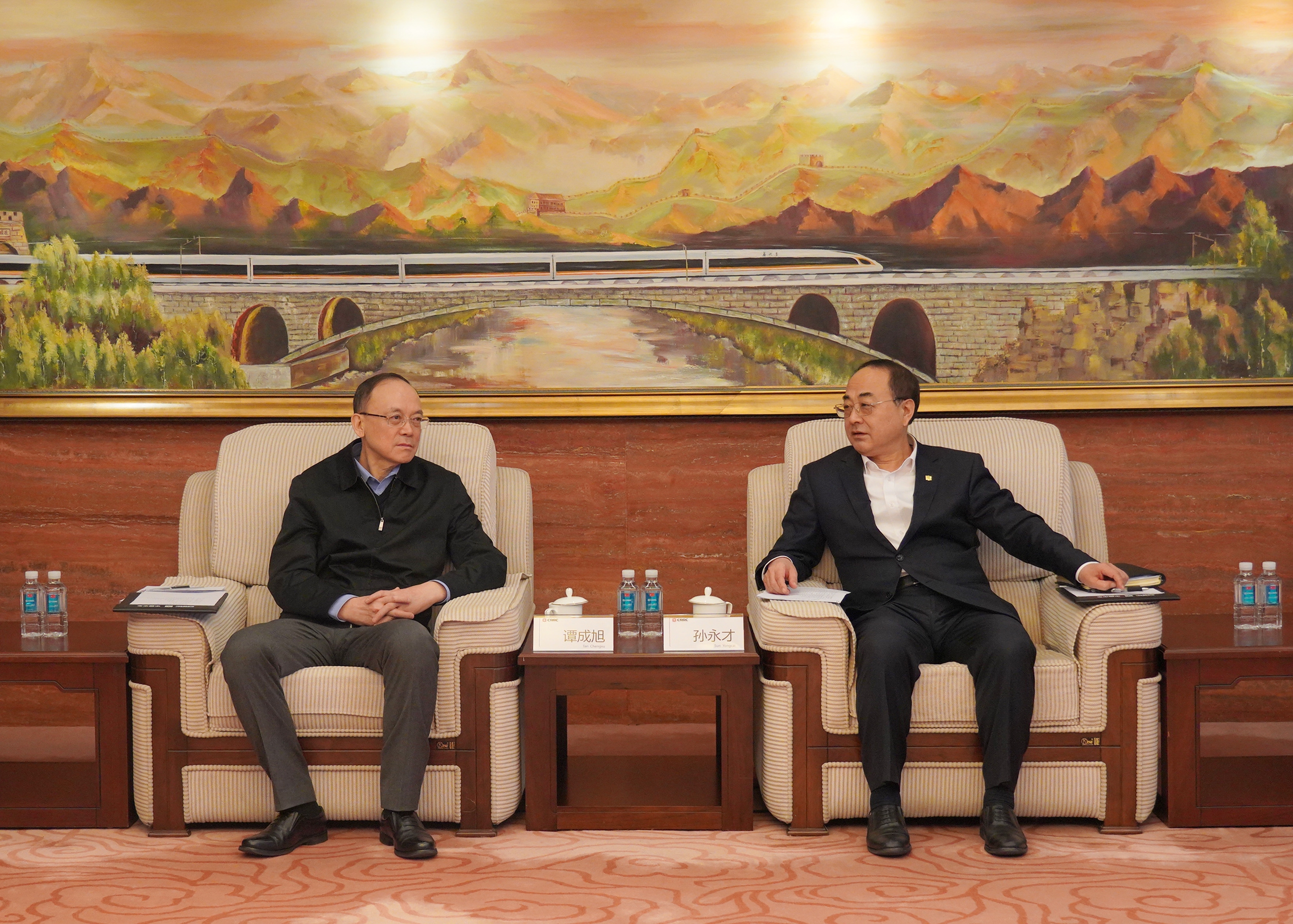 1月29日,中国中车集团党委书记、董事长孙永才在中车总部会见鞍钢集团党委书记、董事长谭成旭一行并座谈交流。中国中车党委常委、副总裁王锋,鞍钢集团党委常委、副总经理徐世帅参加座谈。