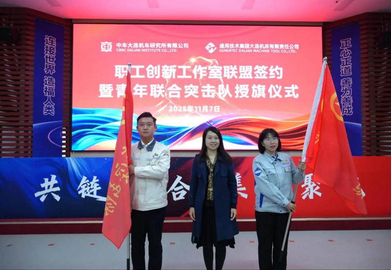中车大连所&通用技术大连机床公司职工创新工作室联盟签约暨青年联合突击队授旗仪式圆满举行。11月7日上午,在中车大连所旅顺所区,以“共链融合 集智聚能”为主题,两家企业职工创新工作室联盟签约暨青年联合突击队授旗仪式隆重举行。