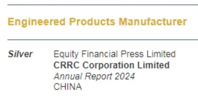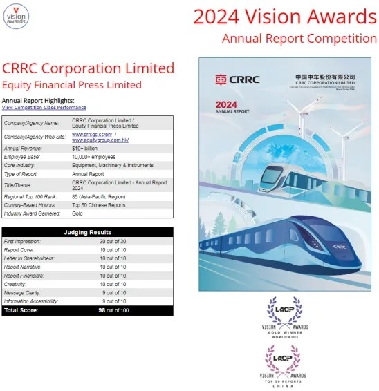CRRC’s 2024 Annual Report achieved an overall score of 98 out of 100, receiving full marks in several categories including First Impression, Cover Design, Letter to Shareholders, Narrative, Financial Presentation, and Creativity. Out of nearly 1,000 participating listed companies, the judging panel gave CRRC’s report high acclaim for its excellence in content and presentation.
