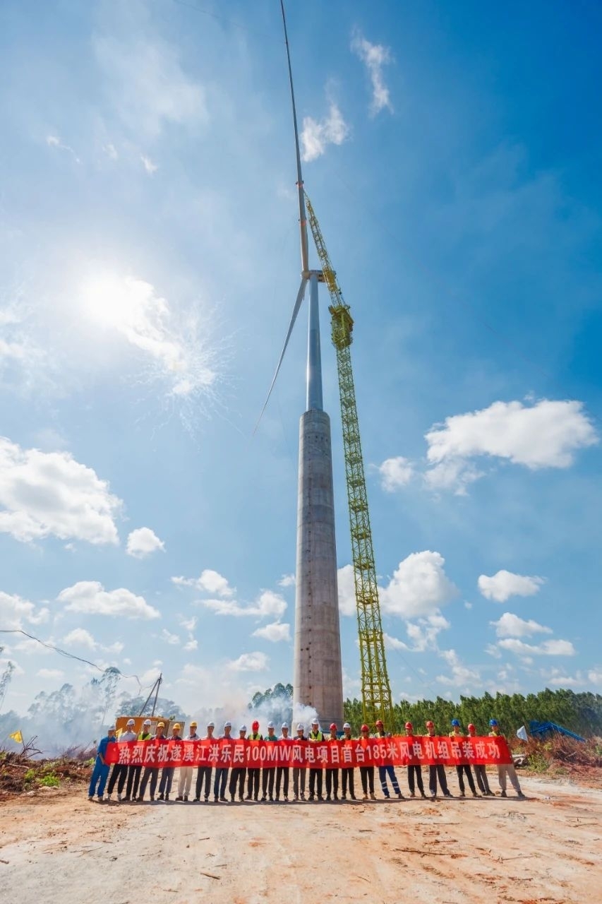 El proyecto de energía eólica Suixi Jianghong-Lemin de 100 MW completó recientemente la instalación de su primera torre de turbina eólica híbrida de 185 metros. No solo es la torre de turbina eólica terrestre más alta del mundo, sino también el primer proyecto de energía eólica a nivel mundial con una torre ultra resistente a tifones implementada en una zona con tifones frecuentes.