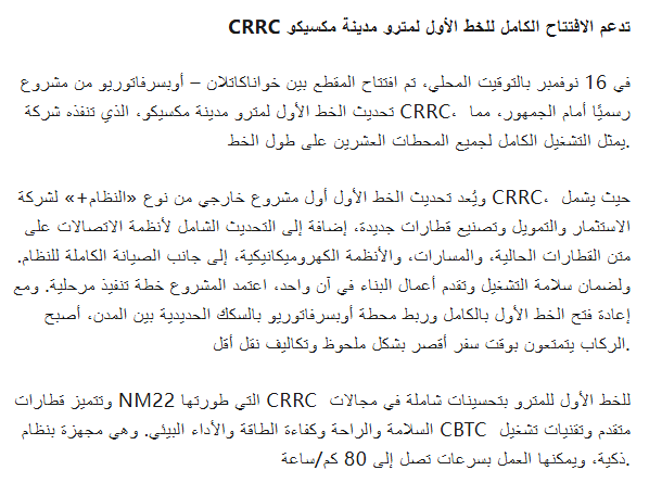 CRRC تدعم الافتتاح الكامل للخط الأول لمترو مدينة مكسيكو