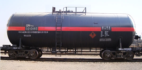 GN70A型对二甲苯罐车载重67t,轴重23t,总容积78.1m3,商业运行速度120km/h,主要用于装运对二甲苯类及其类似介质,装卸方式为上装上卸。该车采用无中梁结构,主要由罐体、牵枕、加热管路、制动装置、侧梯及走台、17型E级钢车钩、大容量缓冲器、转K6型转向架等组成。
