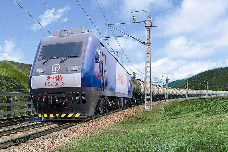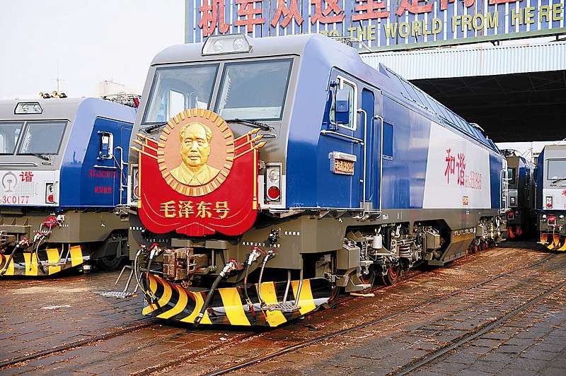 图为功率9600千瓦的HXD3B型机车,是我国拥有自主知识产权的,目前世界上单机功率最大、技术水平最高、性能指标最先进的中国品牌机车,是我国未来铁路货运主型机车。2010年12月26日,“毛泽东号”机车第四次换型,由内燃机车改为电力机车,选用的就是这种车型。