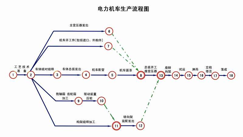 一台电力机车的生产流程从毛坯投料、加工组装直至试运交检需要在5条生产线上完成,即:主变压器生产线、车体焊接生产线、转向架生产线、总组装生产线和交车生产线。