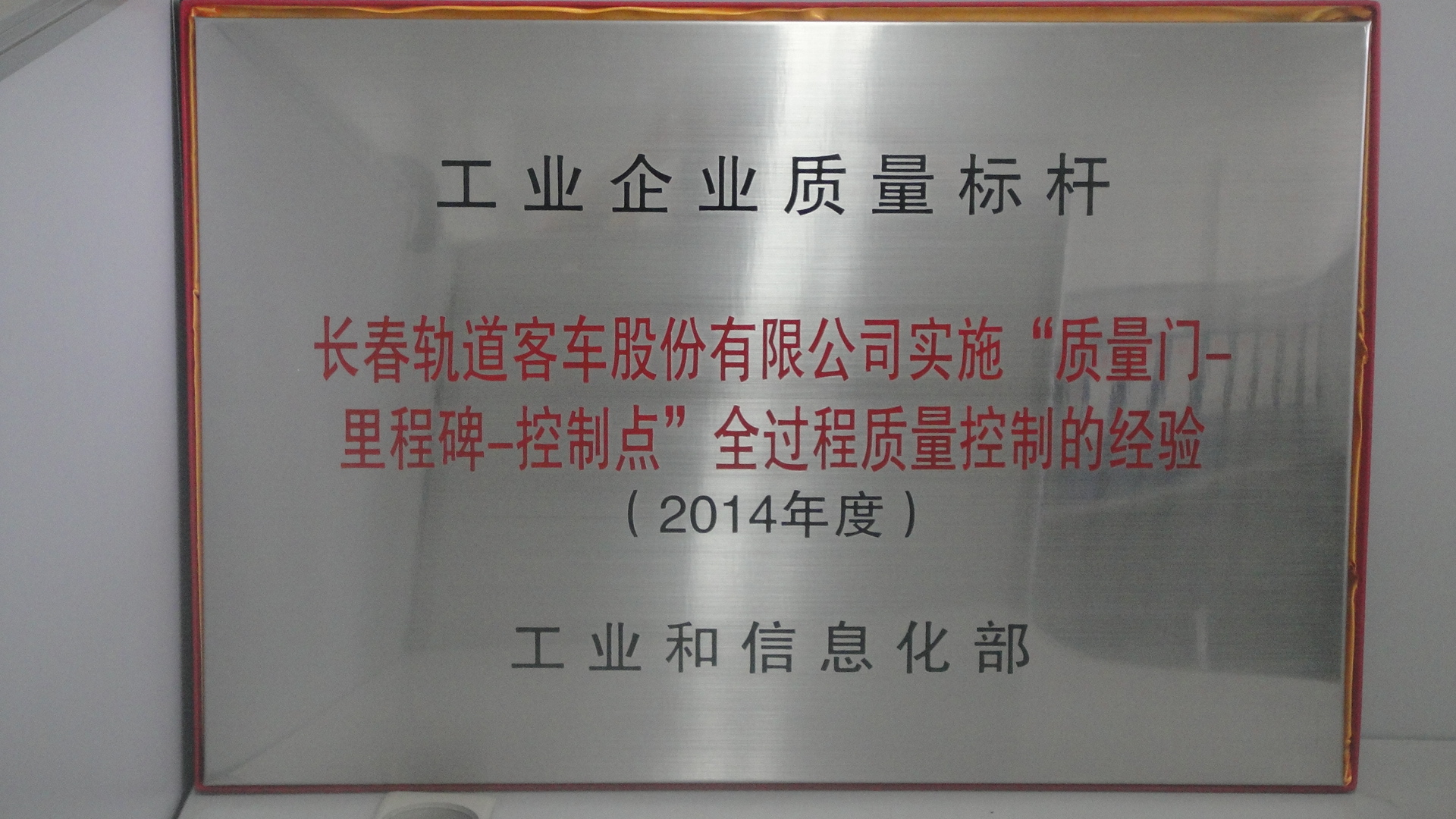 7月10,国家工业和信息化部在山东省青岛市举办2014年第一期质量标杆经验交流专题会,对2014年度30项全国工业企业质量标杆进行了表彰并授牌。中国北车长客股份公司“实施‘质量门-里程碑-控制点’全过程质量控制的经验”被评为2014年度全国“质量标杆”。