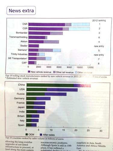 这一排名以轨道交通装备企业的新造机车车辆的销售额为标准,中国北车以超过80亿欧元的销售收入位居首位。中国南车、加拿大庞巴迪、俄罗斯运输机械公司、法国阿尔斯通、瑞士施塔徳勒公司、德国西门子、美国三一工业公司、美国GE公司、西班牙卡夫公司分别位居第二至第十位。俄罗斯乌拉尔车辆厂退出前十名。