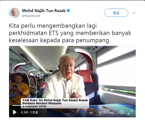 纳吉布推特:“今早乘坐(株机造)ETS动车组去丹蓉马林,非常舒适!”