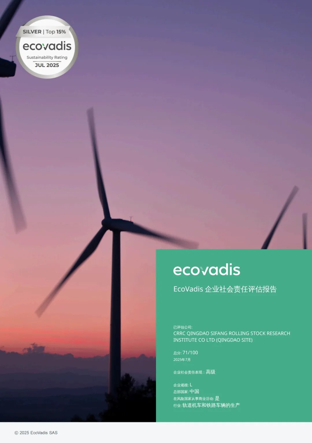 近日,中车四方所(中车制动)在EcoVadis企业社会责任评级中获得银牌,ESG实践成效获得国际认可。