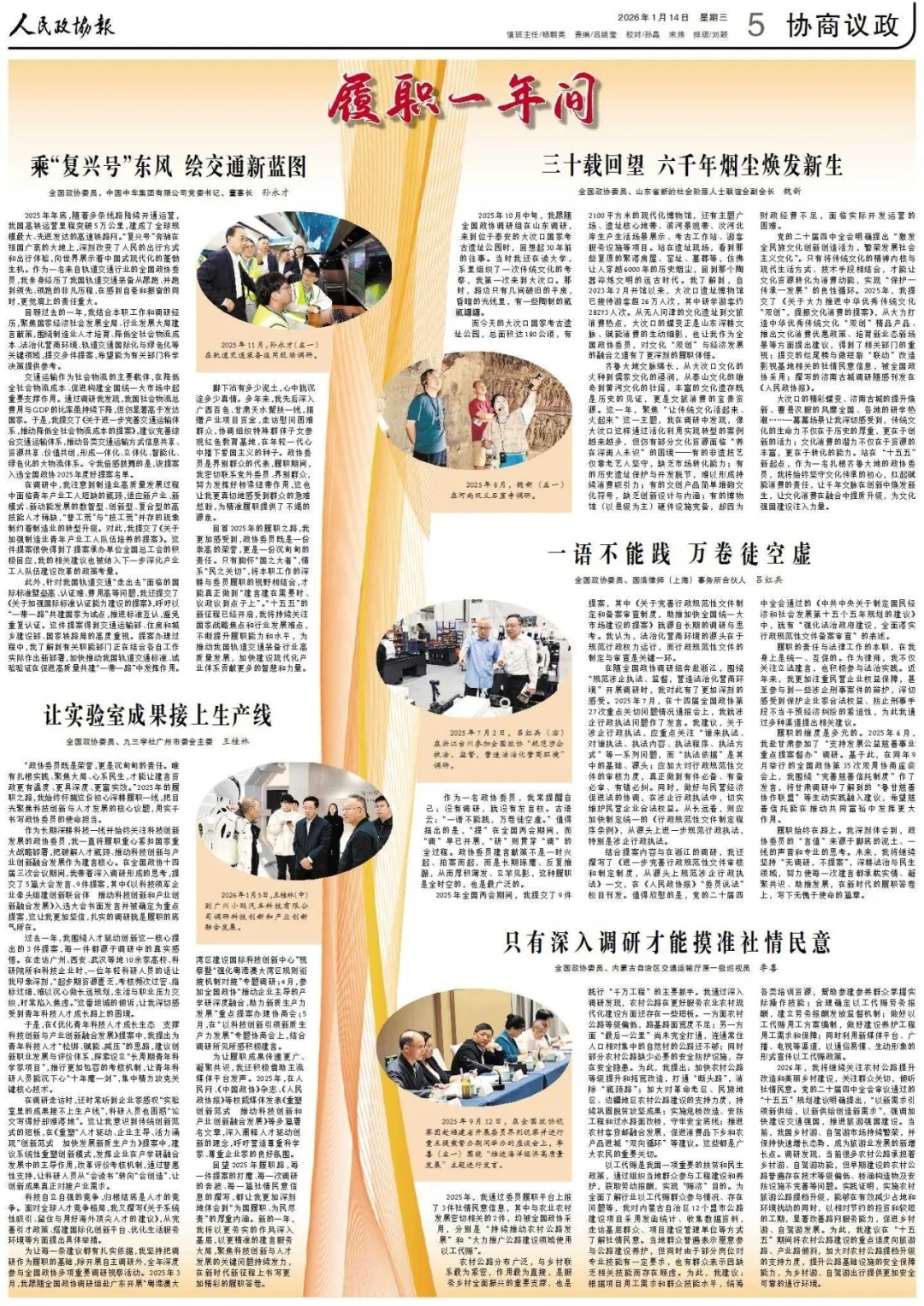 回首2025年的履职之路,我更加感受到,政协委员既是一份崇高的荣誉,更是一份沉甸甸的责任。只有胸怀“国之大者”,情系“民之关切”,将本职工作的深耕与委员履职的视野相结合,才能真正做到“建言建在需要时、议政议到点子上”。“十五五”的新征程已经开启,我将持续关注国家战略焦点和行业发展难点,不断提升履职能力和水平,为推动我国轨道交通装备行业高质量发展,加快建设现代化产业体系贡献更多的智慧和力量。