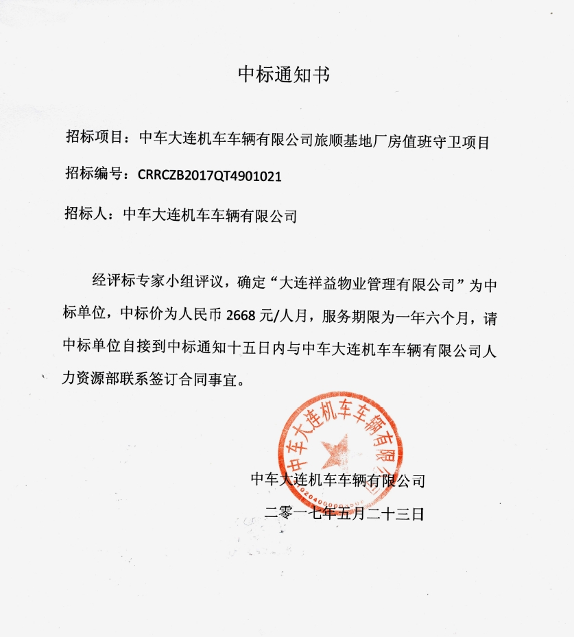中车大连机车车辆有限公司旅顺基地厂房值班守卫项目中标通知书