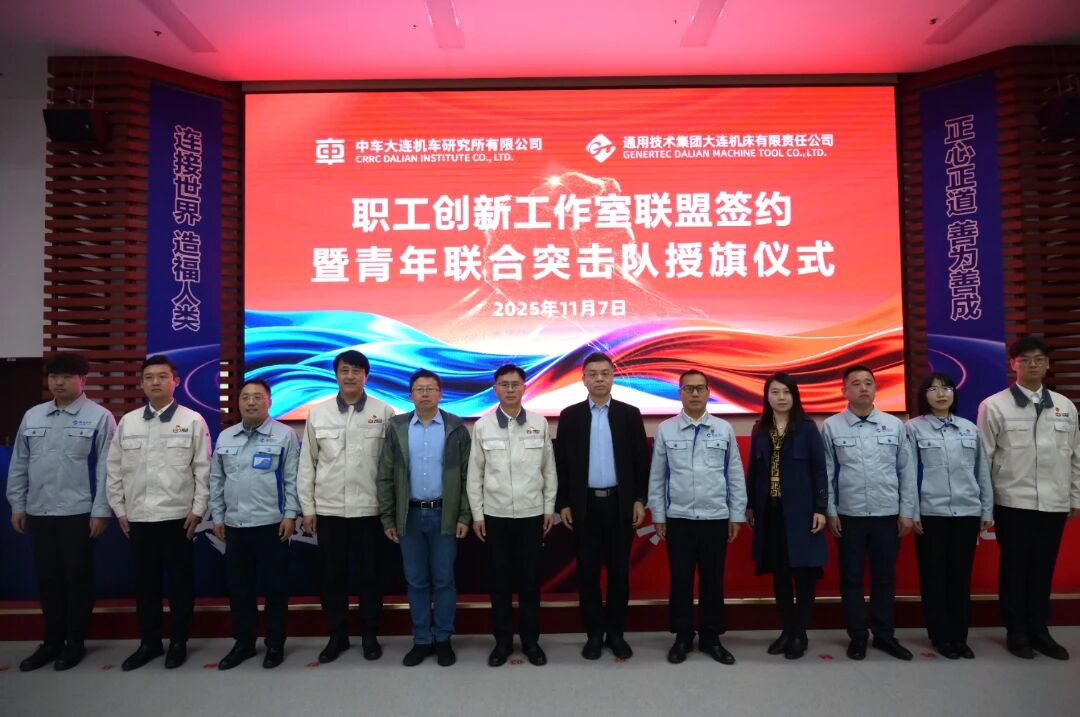 中车大连所&通用技术大连机床公司职工创新工作室联盟签约暨青年联合突击队授旗仪式圆满举行。11月7日上午,在中车大连所旅顺所区,以“共链融合 集智聚能”为主题,两家企业职工创新工作室联盟签约暨青年联合突击队授旗仪式隆重举行。