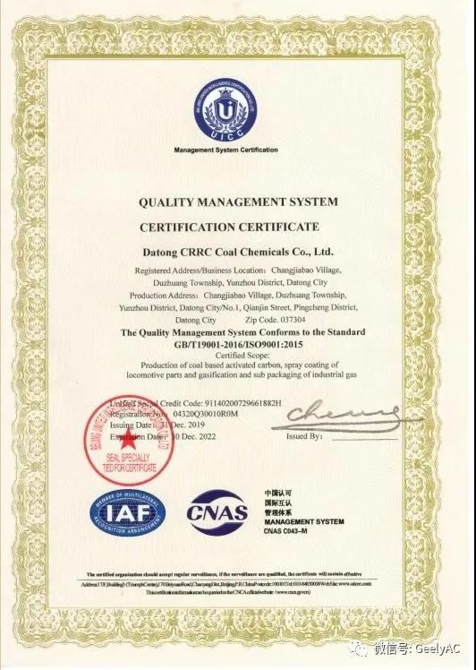 Quality management system certification certificate