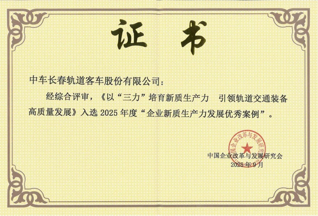 The China Enterprise Reform and Development Society recently announced the results of the 2025 Outstanding Cases of New Productive Forces Development. Four submissions from CRRC Group—by CRRC Changchun Railway Vehicles Co., Ltd., CRRC Times New Materials Technology Co., Ltd., CRRC Yangtze Co., Ltd., and CRRC Guiyang Co., Ltd.—stood out among more than 500 entries and were selected as outstanding cases.