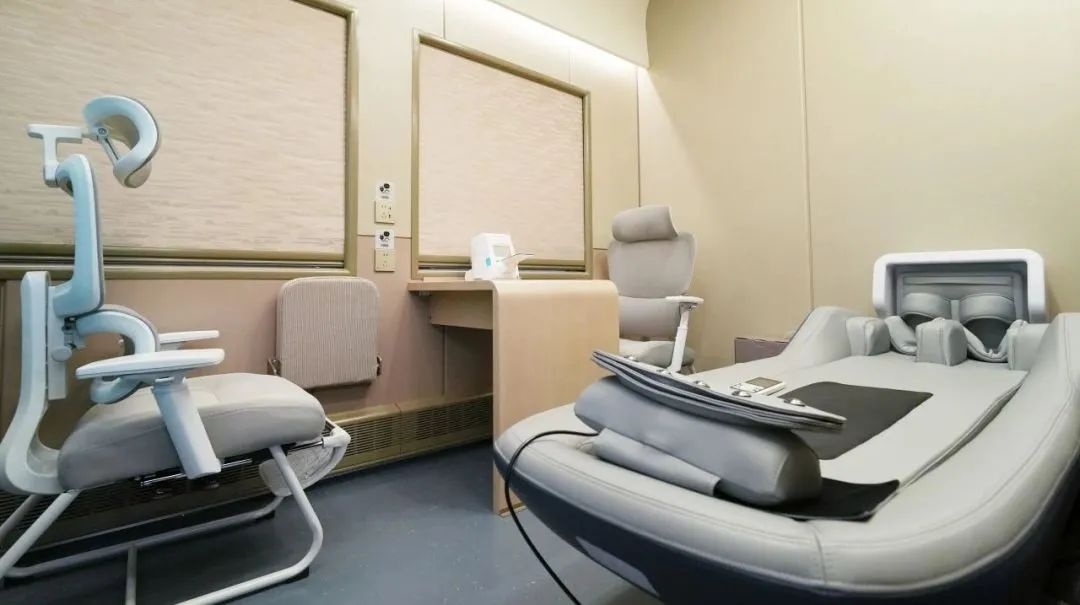 El coche multifuncional añade variedad y disfrute al viaje. El rincón de lectura está equipado con una estantería, un sofá y una pantalla, creando un ambiente de lectura cómodo para los pasajeros. También cuenta con un espacio interactivo para hasta 20 personas, que ofrece diversas actividades de ocio y entretenimiento, como canto, ejercicios físicos y masajes. Además, una sala de salud inteligente permite a los pasajeros mayores beneficiarse de un dispositivo de fisioterapia espinal, un escáner con inteligencia artificial, entre otros.
