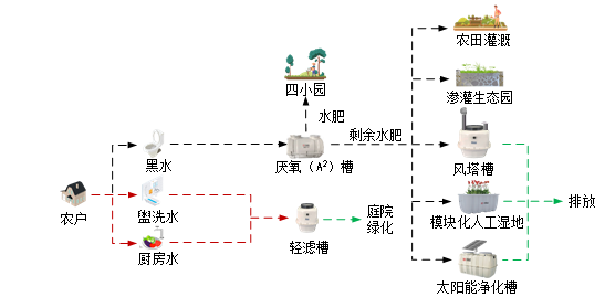 该模式针对传统资源化模式水肥保留率低、应用场景单一问题,通过自研厌氧(A2)槽 + 高效菌剂实现黑水无害化处理,分解产生含 N、P 液态肥,供农户菜园、花园使用。剩余水肥可农田灌溉、渗灌生态园消纳,无应用场景时经风塔槽等设备达标排放。灰水经轻滤槽隔油沉渣后就近利用。