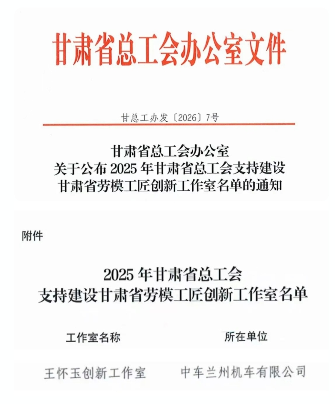 我司喜讯传来,荣耀加冕!近日,甘肃省总工会正式公布2025年甘肃省劳模工匠创新工作室支持建设名单,中车兰州公司王怀玉创新工作室榜上有名,获省总工会支持建设资金5万元。
