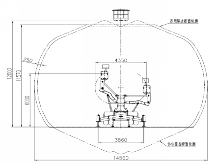 可升降的翼式臂座,在四个多级油缸推动下可实现0°~120°转动,可举升3400mm,整个机构安全平稳,配合钻臂、推进器可实现大断面钻孔;