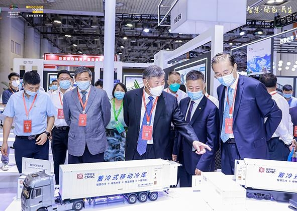 展会现场,蓄冷式智能冷链装备因其无碳排放、恒温保鲜等先进技术优势备受关注,中国交通运输协会会长胡亚东,中国中车党委常委、副总裁马云双等领导莅临展台参观,深入了解中车现代物流解决方案。