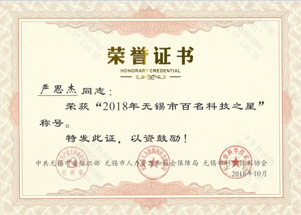 2018年“无锡市百名科技之星”荣誉证书