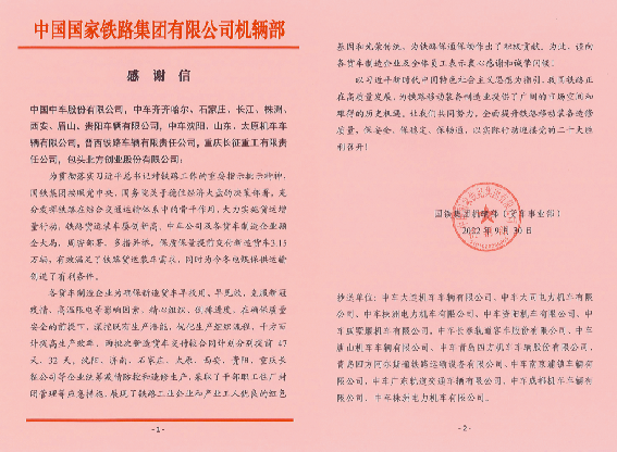 近日,中国国家铁路集团有限公司机辆部向中国中车以及所属各货车制造企业发来感谢信,感谢各企业克服新冠疫情、高温限电等因素影响,保质保量提前交付一标、二标新造货车,为铁路保通保畅作出的突出贡献。
