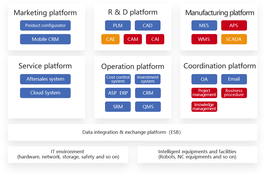 Through the five core systems of PLM, ERP, CRM, SCM and MES, to realize the intelligent, green and information management of the whole process including workshop equipment, production, personnel, quality, materials and environment and other aspects, so as to achieve the digitalization of manufacturing resources, of production process, of on-site operation, of quality management and of material management, as well as to achieve the aims of visualized production speed, real-time data collection, paperless production management and lean production logistics.