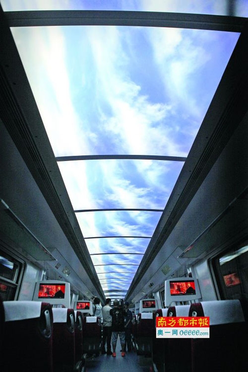 “为适应超长距离乘车的舒适性,内装设计最为突出的特点是开了国内在地铁列车上设置机场专有车厢的先河”,深圳地铁集团工作人员告诉记者,机场专有车厢座椅横排像火车,车厢整个天花板为具有蓝天白云效果的预灯,脚下是泛起点点水花的蓝色地板,加之人性化设施和良好的静音效果,在宽大的车厢内,乘客将感觉到非常舒适。