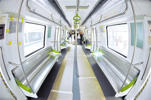 走进车厢内部,记者看到,车内装修走的是“小清新”路线,以白色、银灰色、绿色为主。车内全部采用不锈钢扶手,手抓吊环是绿色;座椅采用玻璃钢结构,纵向排列在车厢两侧,中间有很大的空间,可供乘客站立。大量的扶手杆及杏色的地板,在提升乘车舒适度的同时,为整个车厢营造了安全的乘车环境和沉静、敞亮的空间感受,能够缓解大运量乘客密集所产生的烦躁情绪,带给乘客便捷舒适的出行体验。