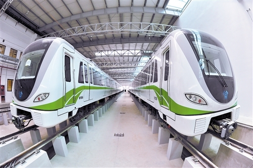 昨天,沿着泥泞的道路,记者来到了屯里车辆段。静卧在铁轨上的两列地铁列车,张着“大眼睛”,身着“绿腰带”,在整体白色车身与细腻流线型车头的映衬下,极具生机与活力,给人以清新的感觉。