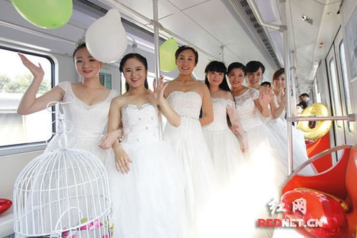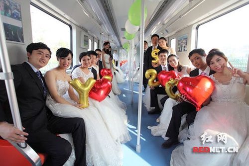 红网株洲10月24日讯(时刻新闻记者 张珍 通讯员 颜常青 刘天胜)“各位新人请注意,您乘坐的幸福号列车即将出发”……今日上午,随着全长140米的上海11号线地铁徐徐启动,中国中车株机公司24对新人乘坐“最长婚车”,驶入幸福殿堂。