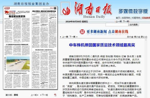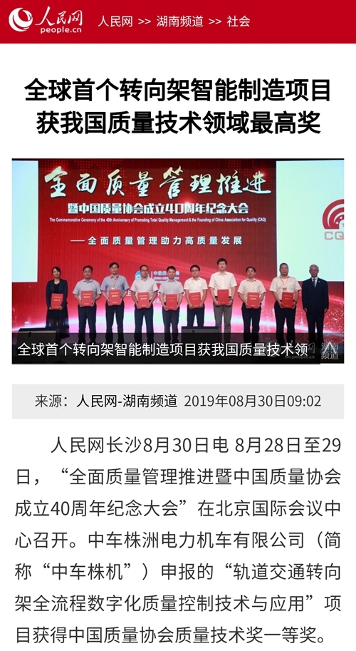 科技日报长沙8月29日电 (记者 俞慧友 通讯员 梁超 张灿强)29日,“全面质量管理推进暨中国质量协会成立40周年大会”在京召开,中车株洲电力机车有限公司开展的全球首个转向架智能制造项目,获国家质量技术最高奖。这一项目的成功实施,在全球率先实现了转向架制造的全流程数字化,探索出了一套有效的高端装备领域质量管理新模式。