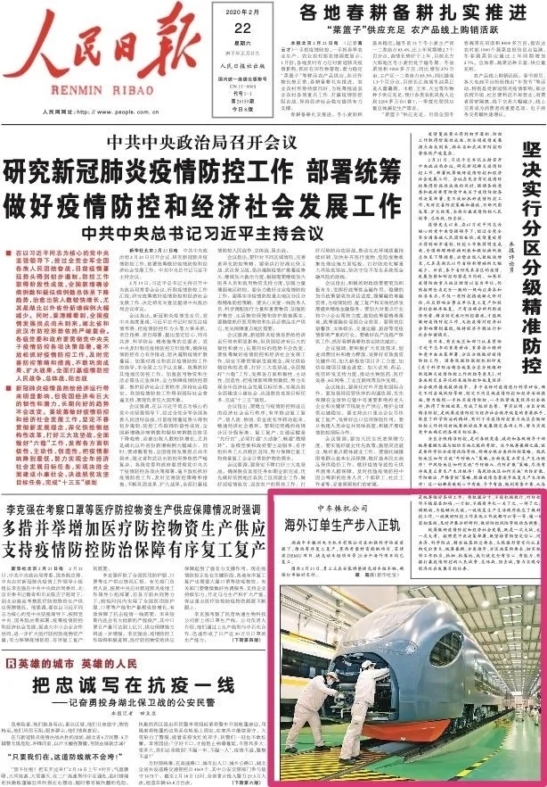 2月22日,《人民日报》和《新华每日电讯》两份数百万发行量的大报同时聚焦湖南复工复苏要闻,这一“双头版”的宣传画风极为少见。