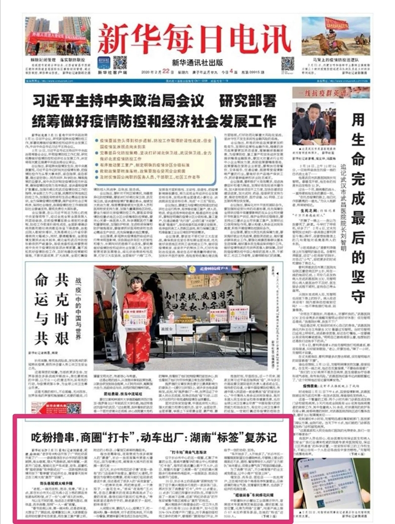 《新华每日电讯》头版刊发《吃粉撸串,商圈“打卡”,动车出厂:湖南“标签”复苏记》的长篇通讯,报道因新冠肺炎疫情而按下“暂停键”的经济社会,随着春天到来正在三湘大地“复苏”“回暖”。从动车组生产线到磁浮列车厂房,再到机车转向架焊接车间……“复工复产,我们志在必得”的标语,喊出了湖南“制造强省”的心声。