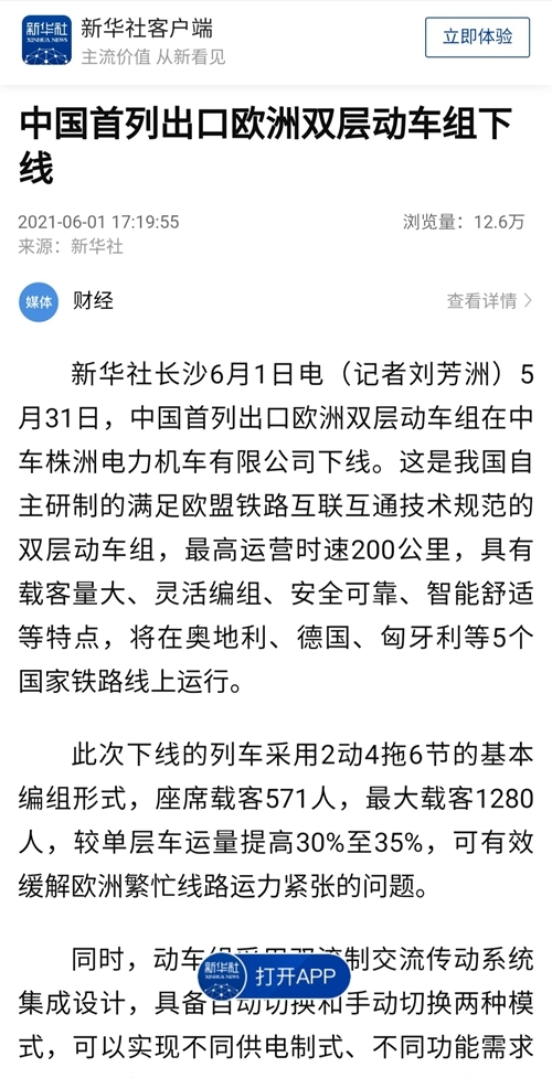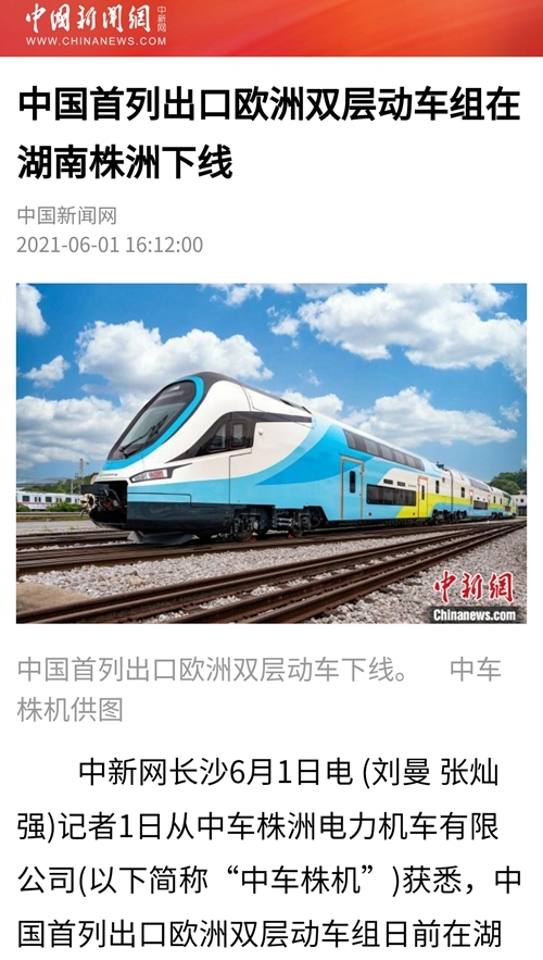 本报长沙6月2日电 (记者孙超)中国首列出口欧洲双层动车组5月31日在位于湖南株洲的中车株机公司下线。这是我国自主研制的满足欧盟铁路互联互通技术规范的双层动车组,最高运营时速200公里,具有载客量大、灵活编组、安全可靠、智能舒适等特点,将在奥地利、德国、匈牙利等5个国家铁路线上运行。