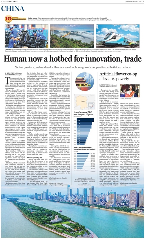 《中国日报》将株机发展成绩作为湖南创新引领高质量发展的典型。报道称:轨道交通装备是中国制造走向世界的一张闪亮“名片”。今年7月,由中车株机研制的墨西哥首都地铁1号线改造项目地铁列车下线,这是中国企业自主研发的首列出口胶轮地铁列车。此前,中车株机生产的列车出口到了马其顿、奥地利等欧洲国家。过去十年是中车株机实现高质量发展的关键十年,一批行业领先的产品走向世界舞台。