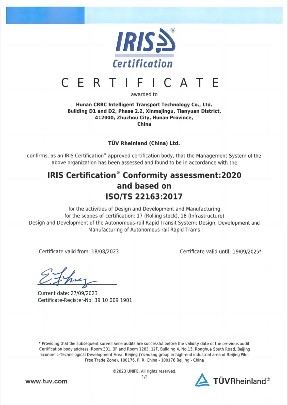 Safety Integrity Level4 Certificate(SIL4) for brake control system in 2025.