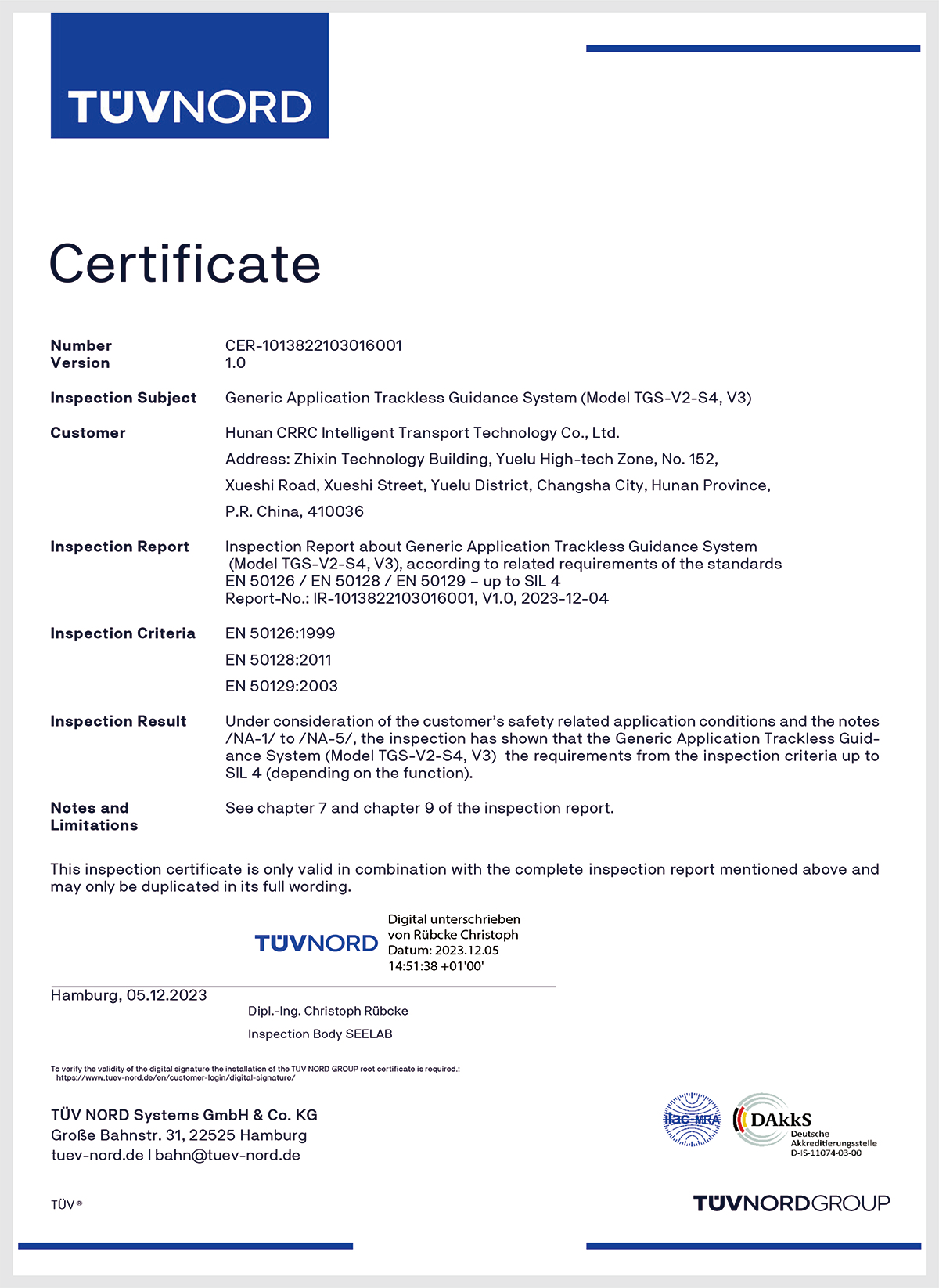 Safety Integrity Level4 Certificate(SIL4) for the track less guidance system in 2023;