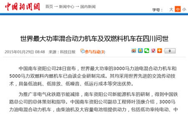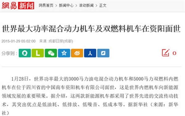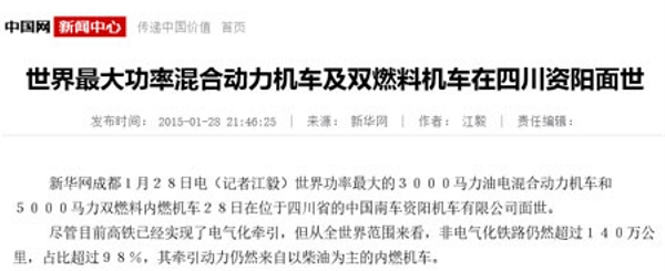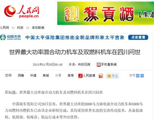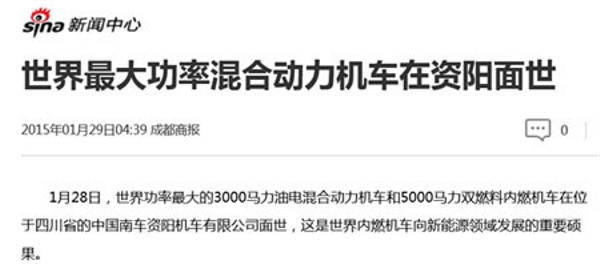 与此同时,新华社播发通稿《世界最大功率混合动力机车及双燃料机车在四川资阳面世》,人民网、中国新闻网、新浪、网易、凤凰网等国家级主流媒体争相转载,国家级报纸《科技日报》更是以头版报眼的位置重点刊登。